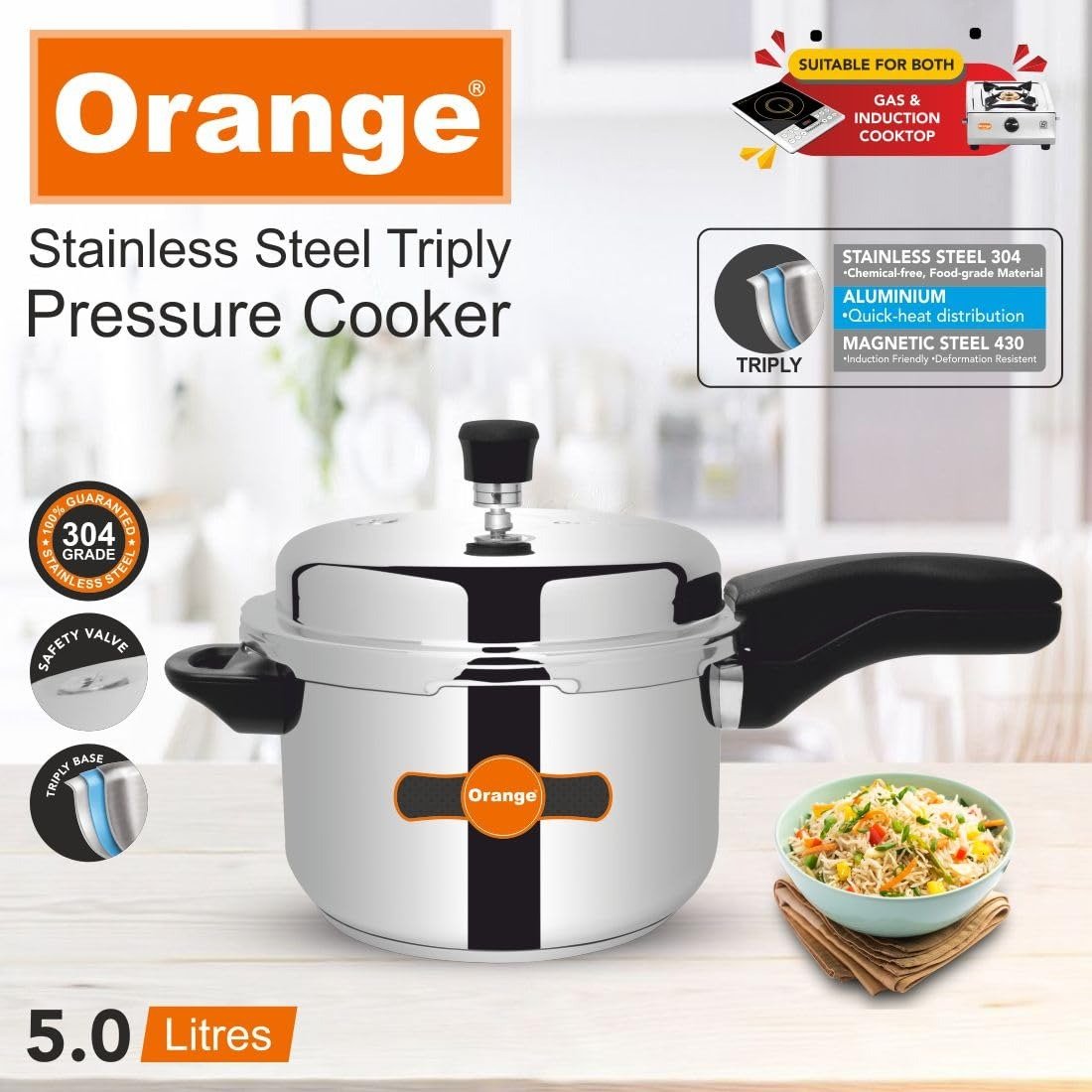 Orange Triply Stainless Steel Outer Lid Pressure Cooker 5L | Induction Friendly | Heavy Bottom | 2.5mm Base Thickness | 5 Year Warranty | Serves 5-6 People