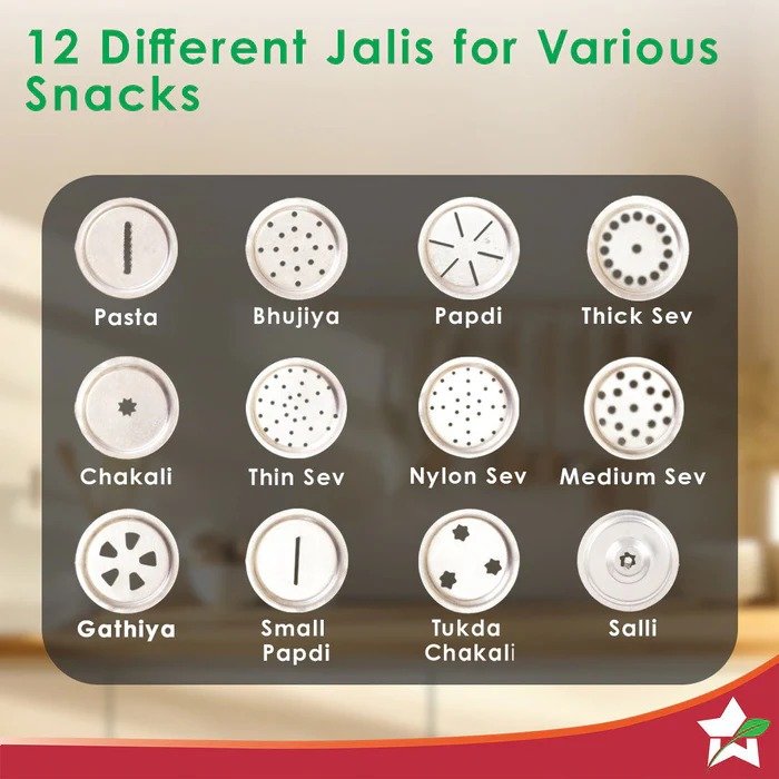 - MULTI-PURPOSE USE: The snack maker comes with 12 differently shaped jalis for making different snacks – from chakli, murukku, sev, to gathiya, bhujiya, pasta and papdi. These plates enable you to make these namkeens quickly and with ease.